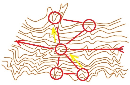 One more example. Butterflies on mountainous terrain, where one loop of butterfly is located above the other (see picture), and the entrance and exit from the butterfly is horizontal, will mean that the athlete who at first has the lower circle and then the upper one, will collect two climbs in a row (two yellow arrows in a row), while the competitors before and after him will run first the upper circle, and then the lower, which will mean splitting a large climb into two shorter ones, and one long descent instead of two. Therefore, to comply with the principle of equivalence of forking, it is better to place the butterfly symmetrically, where both loops will have a similar profile, i.e. along the slope, not across.