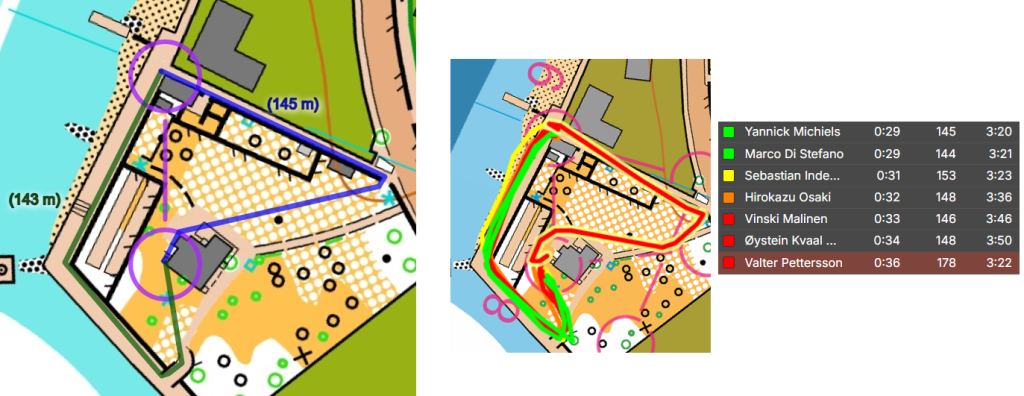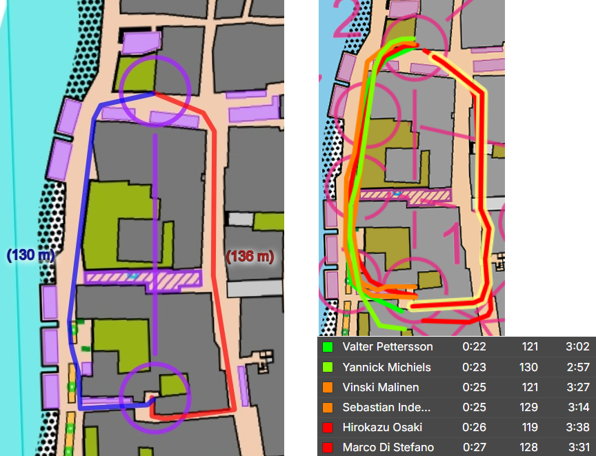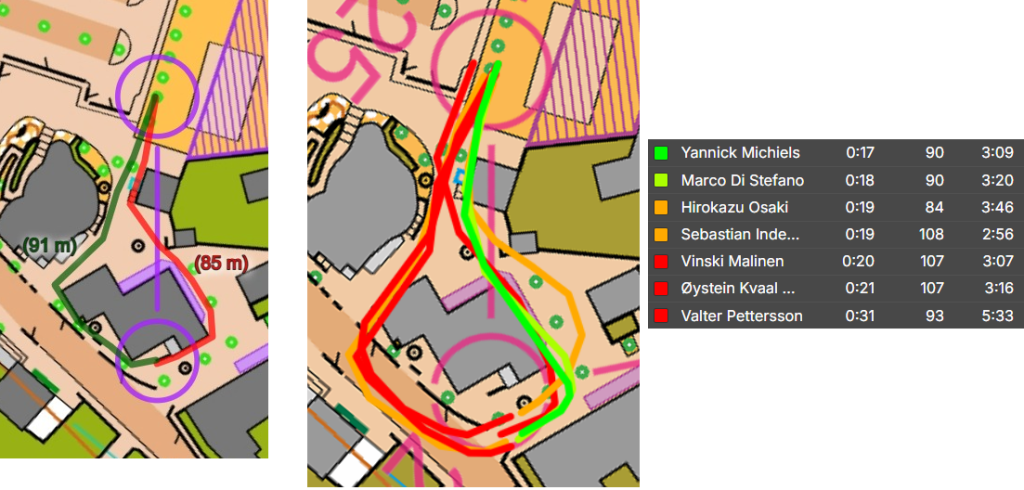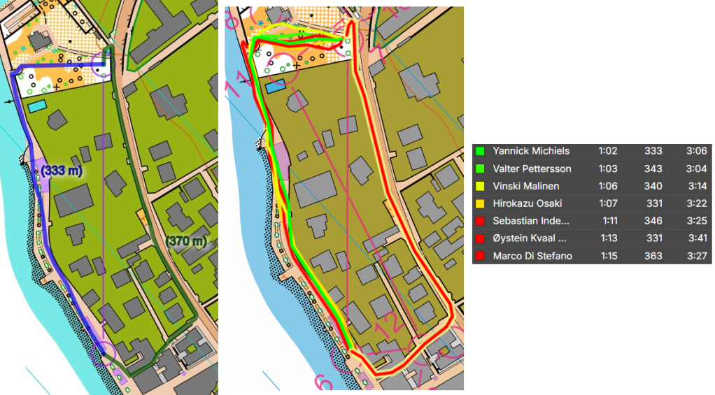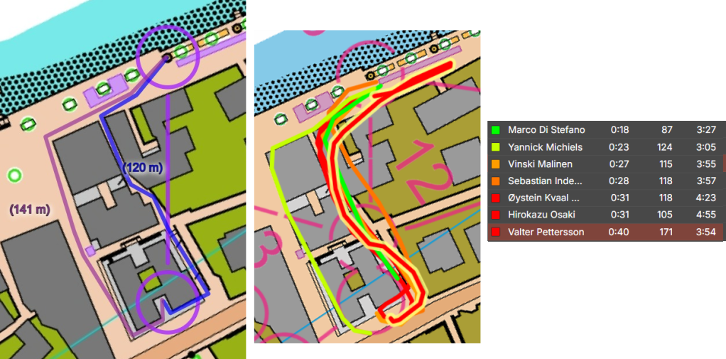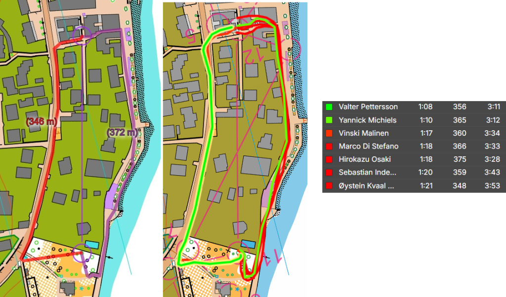 Surprising splits at the second long leg back to the town. The left option is significantly shorter than the right with almost 30m difference but Valter and Yannick have almost equal splits here: