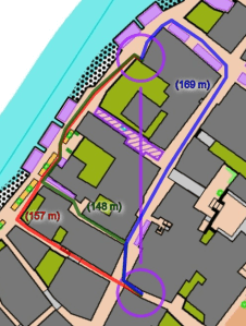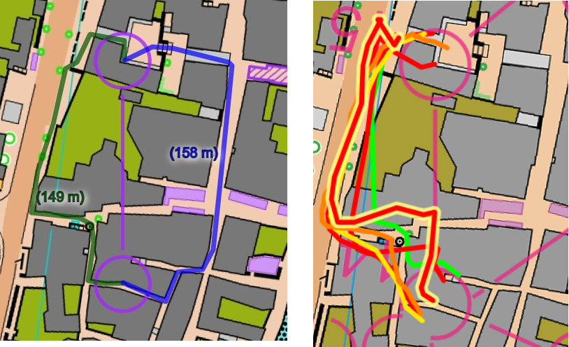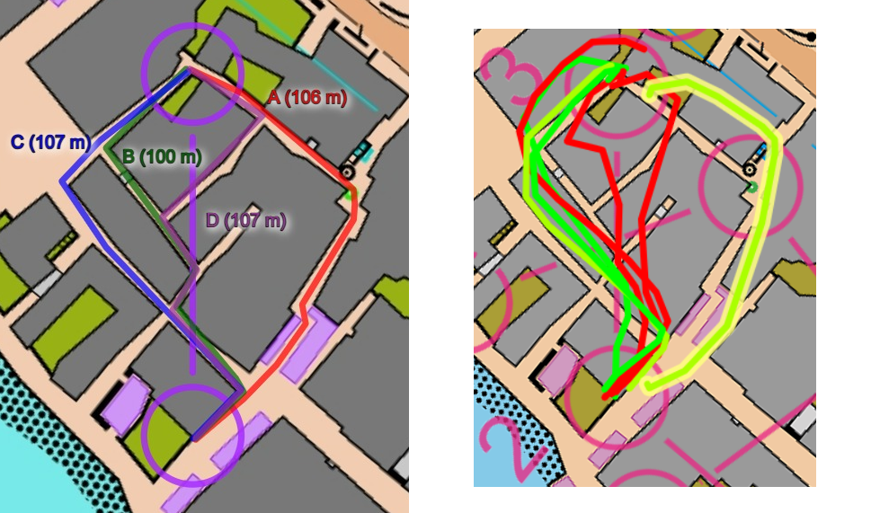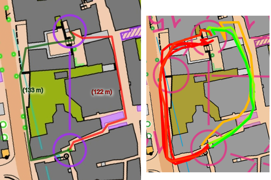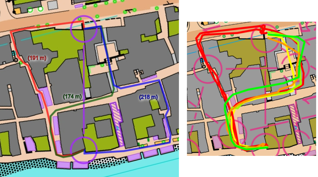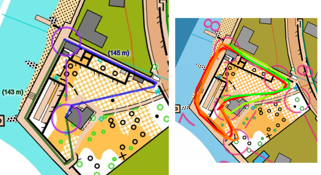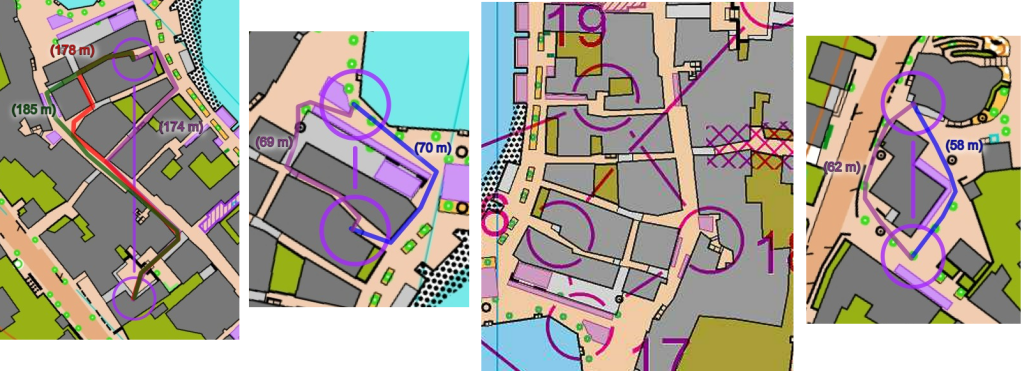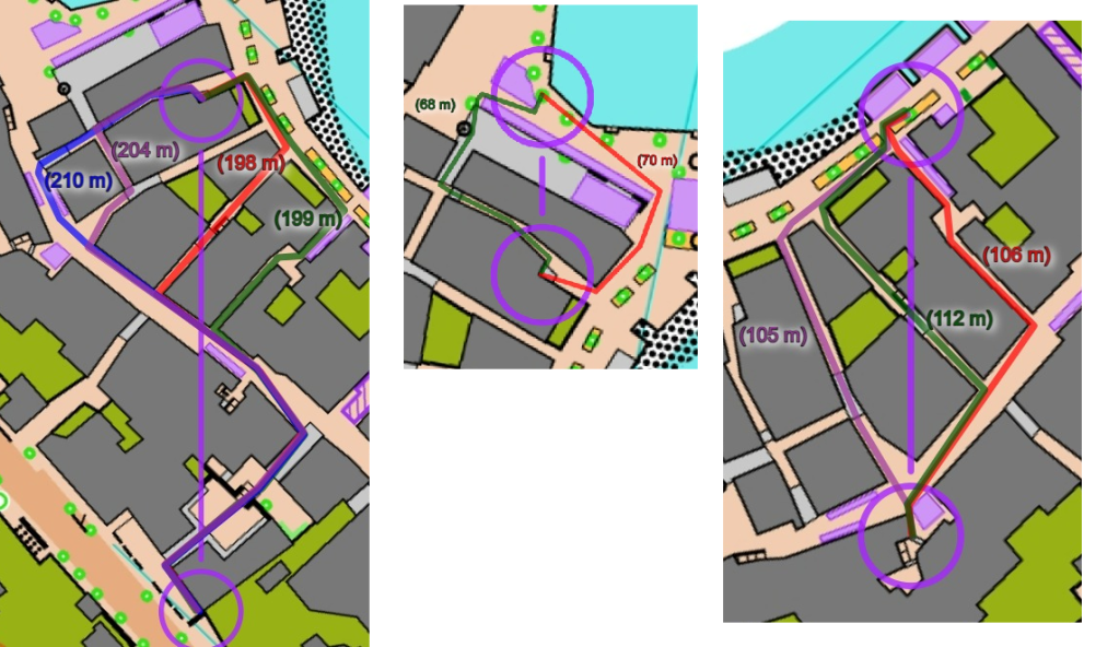 Surprising splits at the second long leg back to the town. The left option is significantly shorter than the right with almost 30m difference but Valter and Yannick have almost equal splits here: