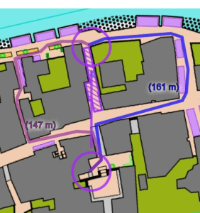 Leg 3, route in the middle (green) is shorter but going around is faster, in wider streets: