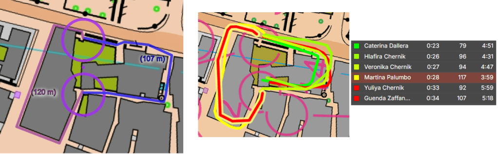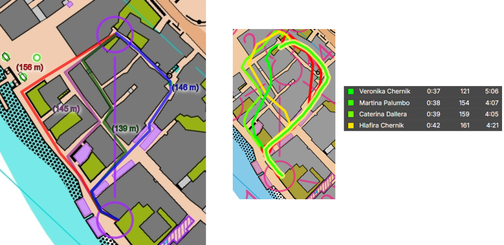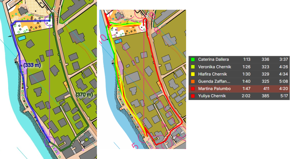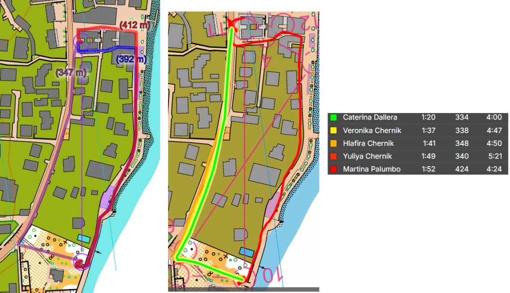 Leg 3 is same as $th leg in mens course, and good route choices here. Martina Palumbo takes the longer options and misses around 5 seconds on this leg: