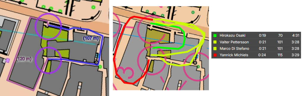 First long leg to the park is important because there is a significant difference in the route choices and taking long option can cost 10-15seconds at least. Here we see that Marco di Stefano is taking the wrong route choice and loses around 15 seconds to the best splits and this is probably the moment where he lost the chance to take the 3rd place (Marco Di Stefano 12:01 +3sec to the bronze in day results):